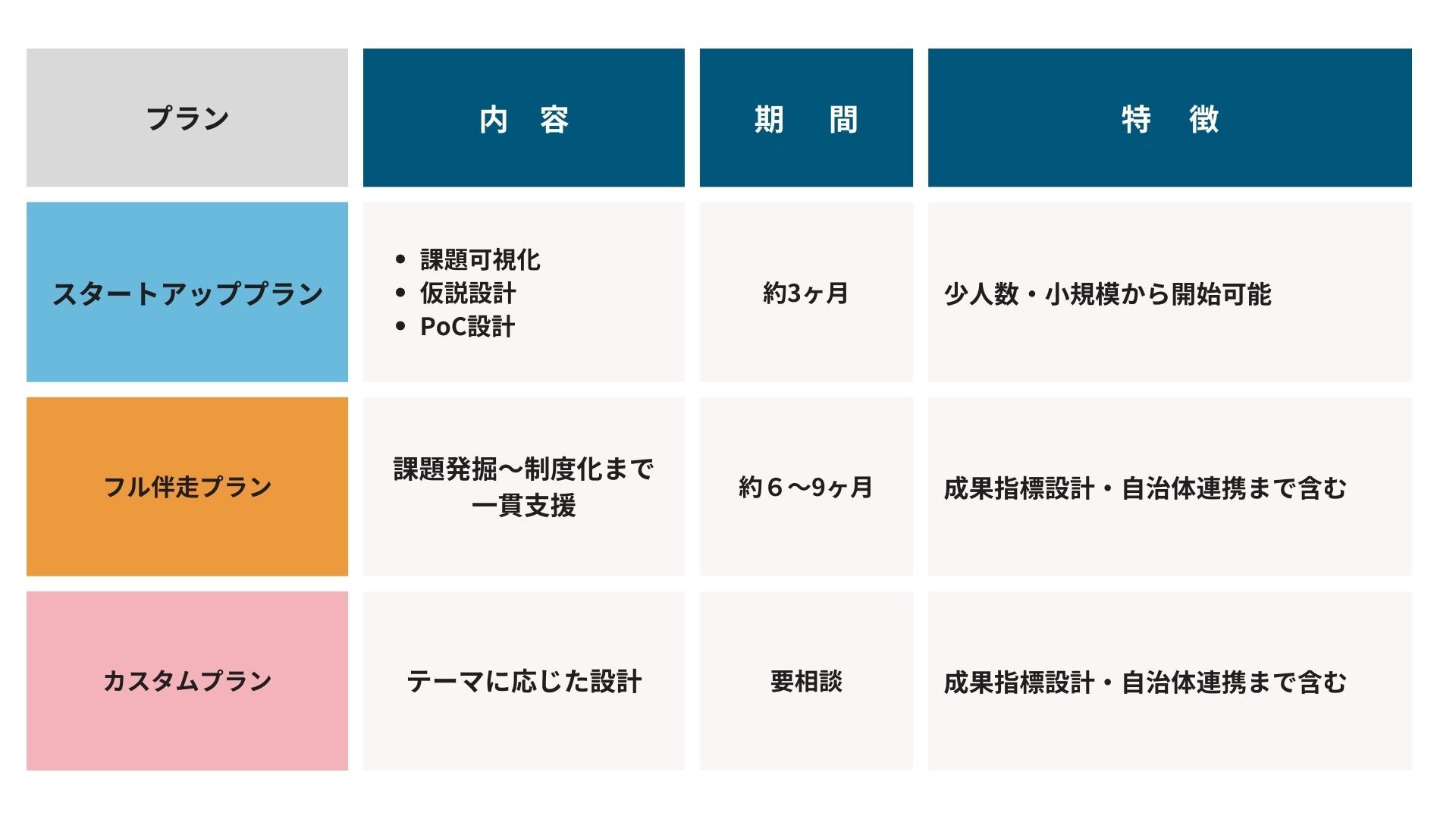 A. 最短3か月のスタートアップ支援から、6〜9か月のフル伴走プランまで対応可能です。